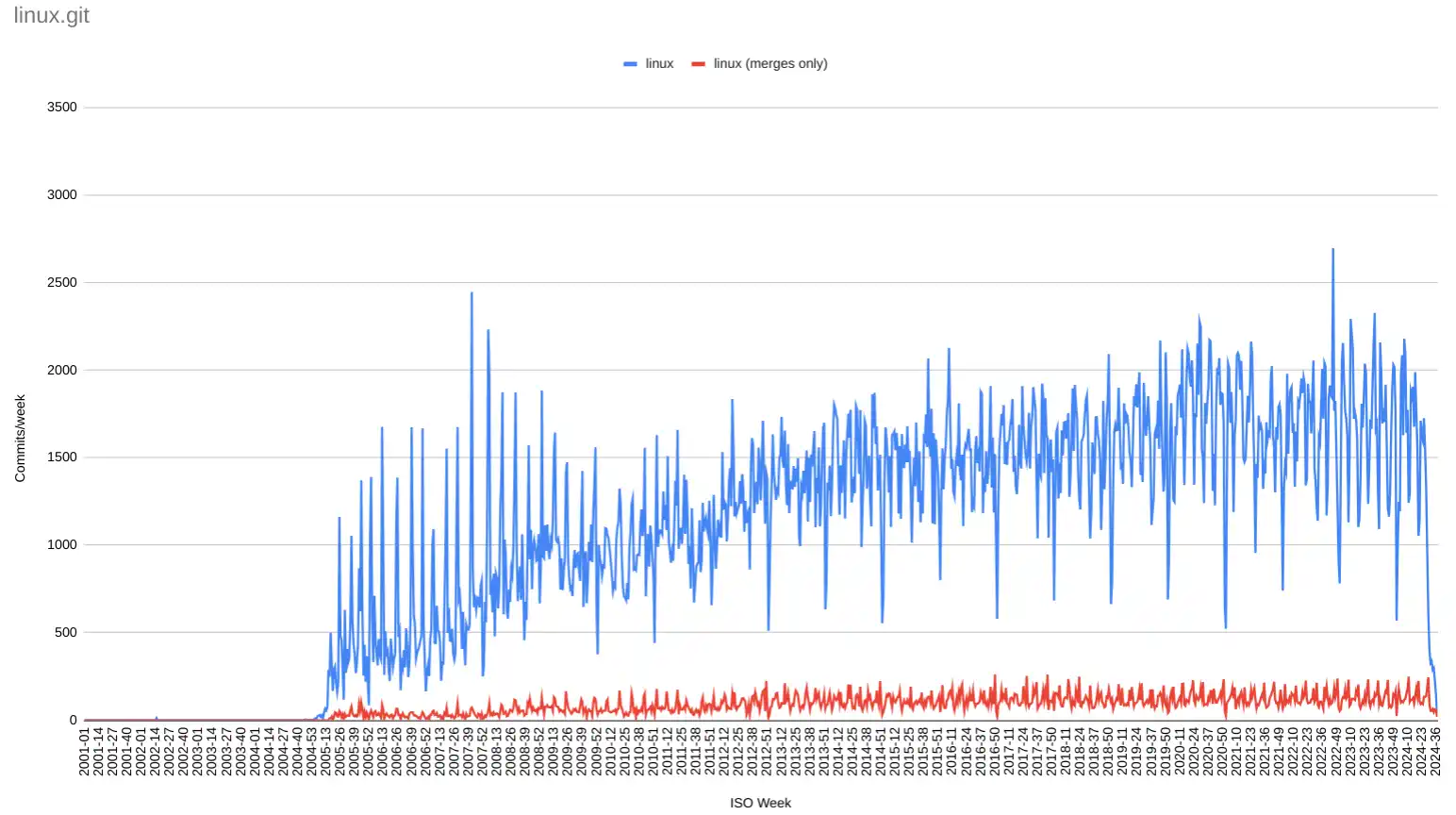 Since the Linux kernel uses a merge workflow, merge commits are the equivalent of a PR. If you count only merge commits, the contribution rate is about 130 per week. It’s the red line in this graph. It’s about 20 changes per day, that’s a lot.